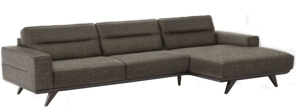 Kotni sestav z ležalnim delom na lesenem podnožju, v svetlo sivi tkanini ( 85.0054.06). Na zalogi leva ali desna postavitev v dveh dimenzijah. Količina omejena.