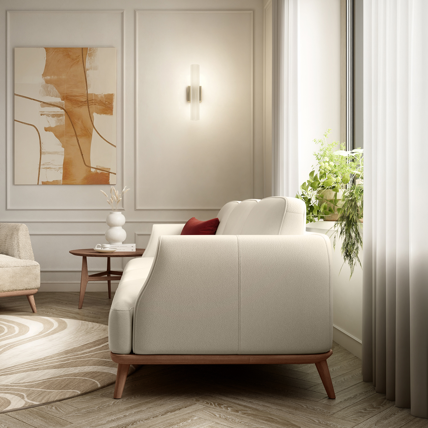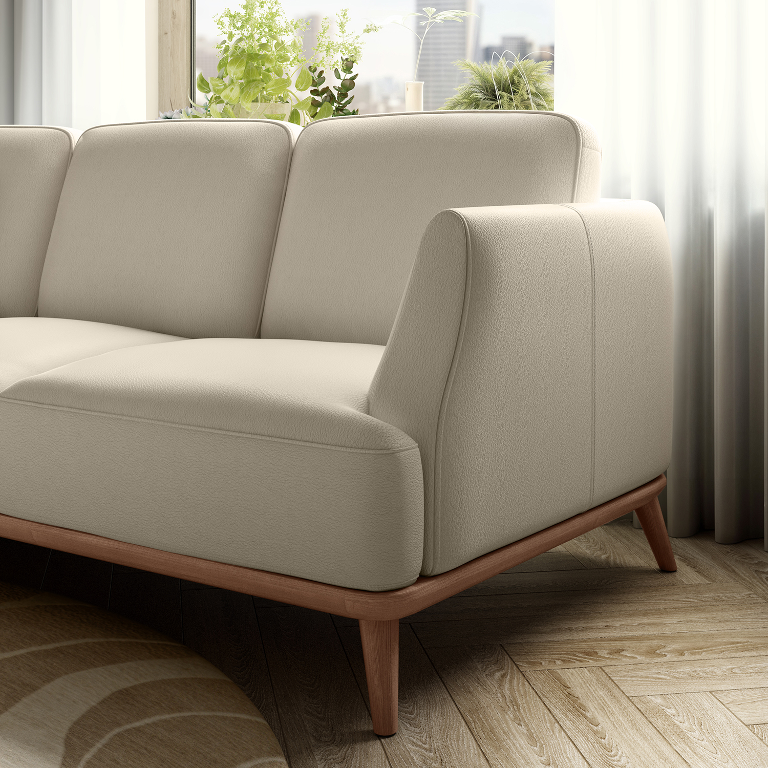 Dovolite, da sedežna garnitura Charlotte prevzame osrednji oder in igra glavno vlogo v vašem bivalnem prostoru. Harmonično presečišče zaobljenih in kvadratnih linij, nabor volumnov, ki se prekrivajo in združujejo, da ustvarijo zofo za prijetne trenutke sprostitve.