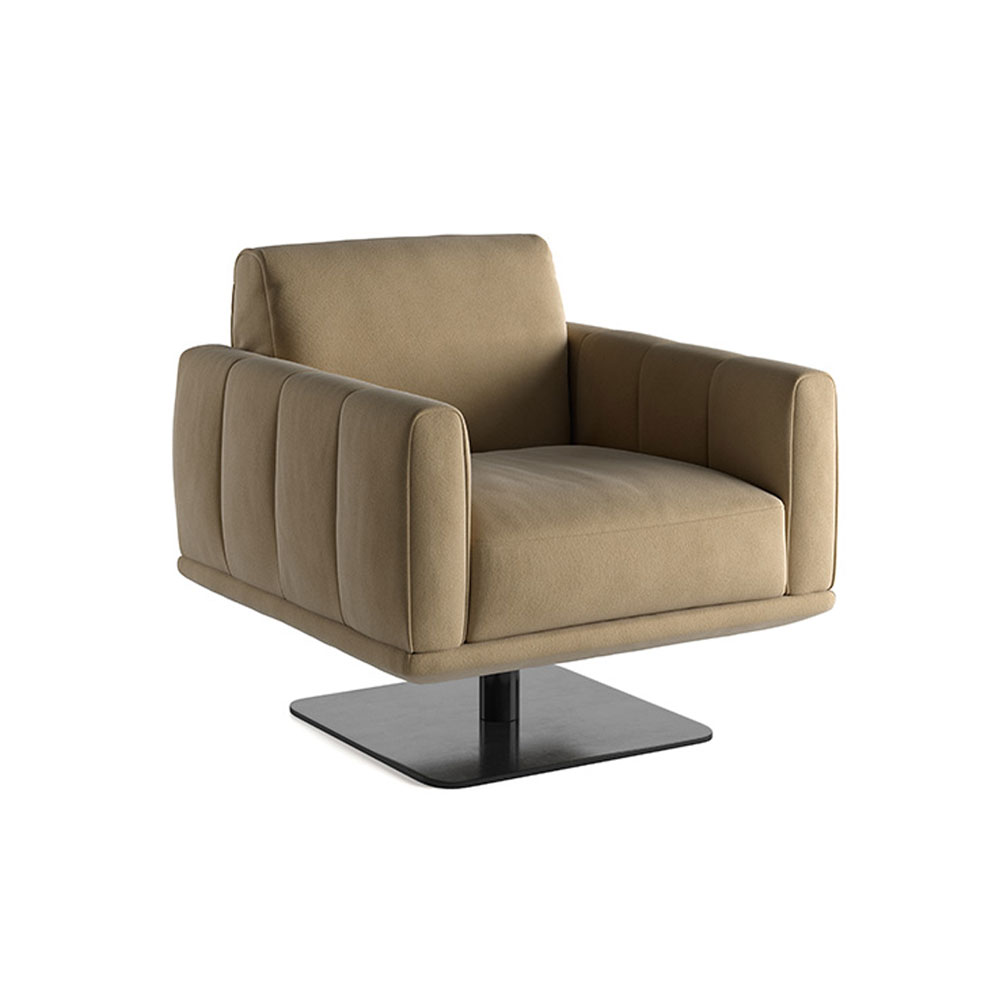 Kovinsko, mat črno podnožje podpira celotno osnovo in ji daje lebdeč videz, ki kljubuje gravitaciji. Jasne, čiste linije opredeljujejo poenostavljeno silhueto, medtem ko edinstveno vertikalno prešitje zaznamuje rokonaslone.