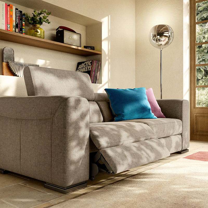 Globoki sedeži, kompaktni rokonasloni in električni mehanizmi Soft Touch sistema, vas bodo popeljali v svet udobja. Z rahlim dotikom na upravljalne gumbe električnega mehanizma, aktivirate funkcijo nagiba hrbtnega dela, hkrati pa odprete naslon za noge. Vzglavnike je mogoče nastaviti ločeno na vsakem sedežu za individualno udobje. Tako se lahko sprostite, ne da bi vam bilo treba vstati s kavča.