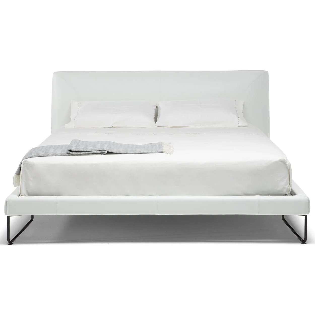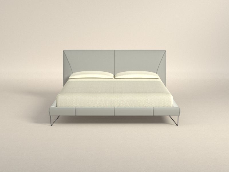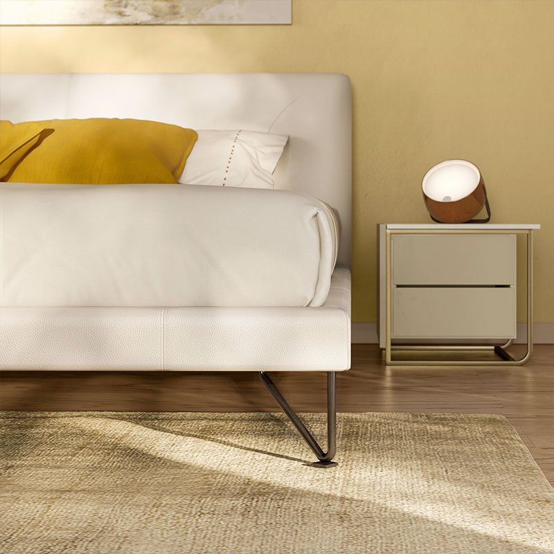 Elegantno, kovinsko podnožje, edinstvene oblike izstopa kot zanimiv detajl, dodan geometrijski zasnovi postelje.