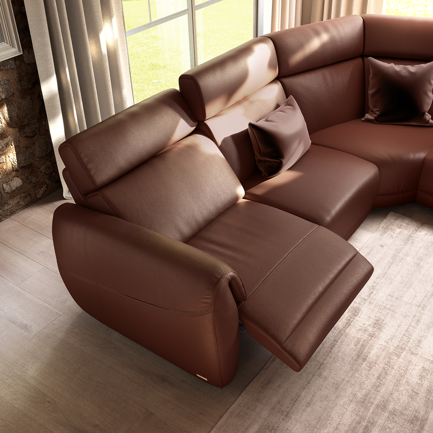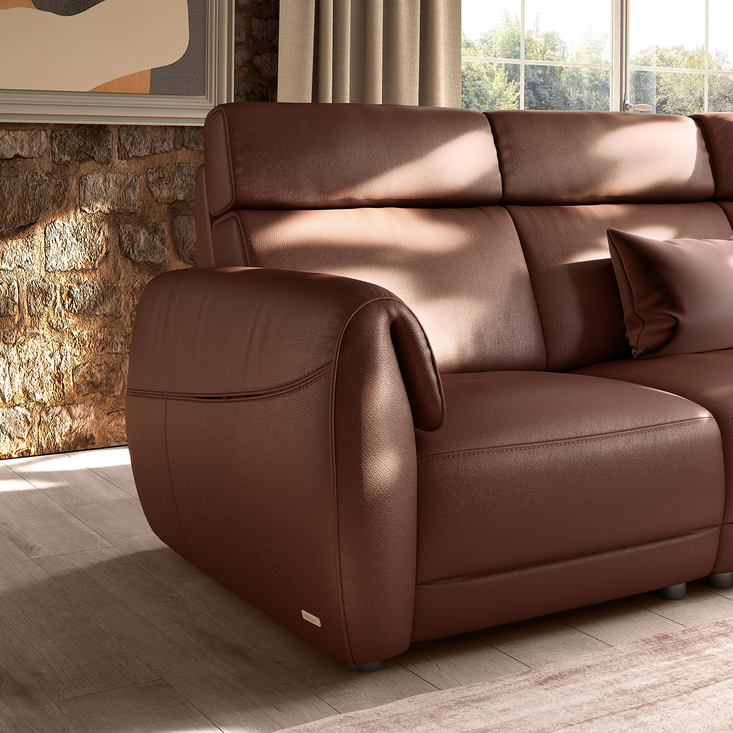 Z zaobljenimi oblikami in prostornostjo vas sedežna garnitura Nuvia vabi v svoj objem in ponuja čudovite trenutke dobrega počutja, kot bi ležali na mehkem oblaku. Njena izjemna funkcionalnost, se poleg ostalih kvalitet, zraža tudi v obliki več funkcijske konzole, katero je možno integrirati v kompozicijo. Konzola s popolnoma leseno površino ima prostorno mizno površino, predal za shranjevanje, vgrajen USB priključek in priključke za dodajanje dodatnih funkcij – ki združujejo slog, udobje in vsestranskost.