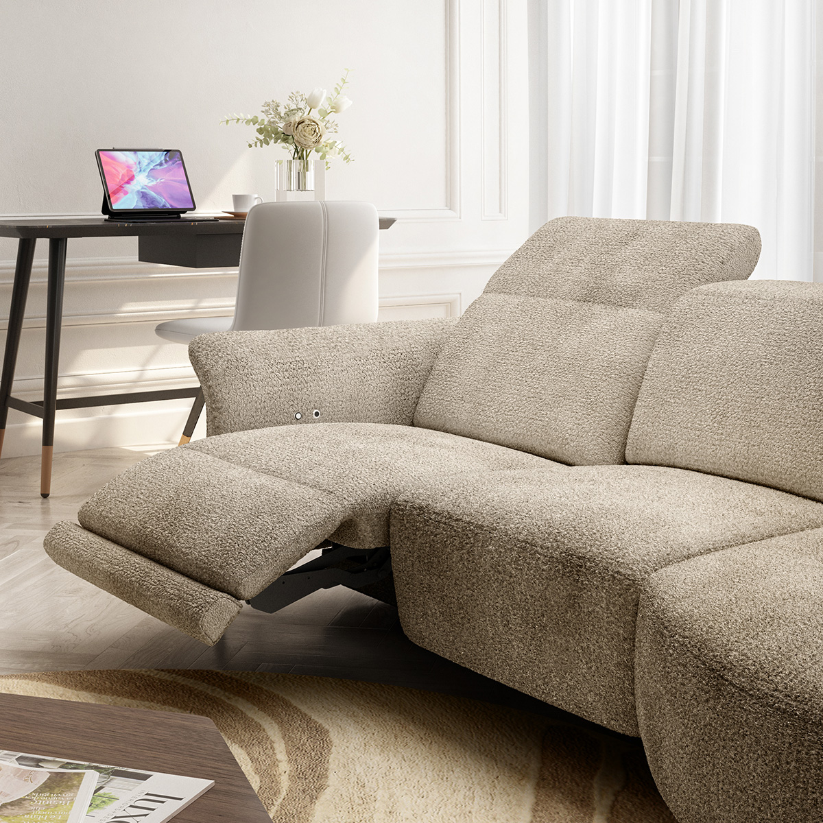 Venezia je lahko opremljena z električnim mehanizmom, ki aktivira gladko nagibanje sedeža, naslonjala in naslona za noge, kar vam omogoča nastavitev udobja. K visoki ravni udobja prispeva tudi ročno nastavljiv vzglavnik.