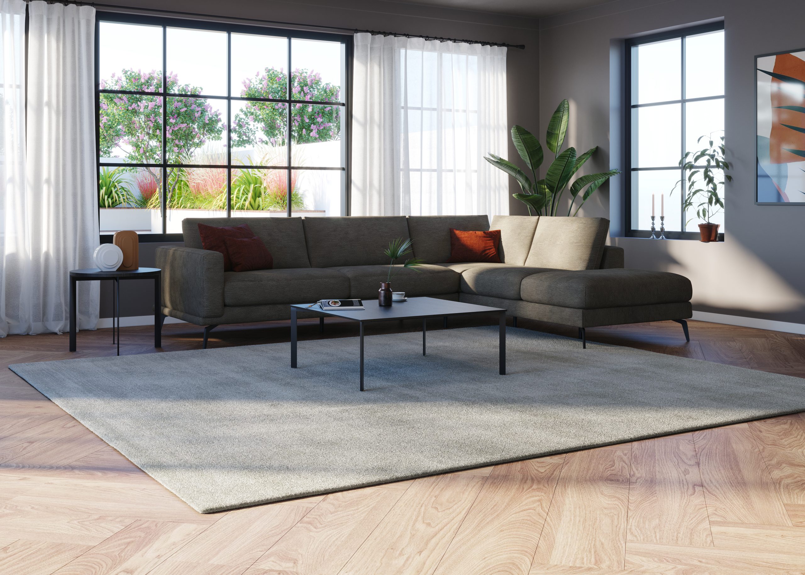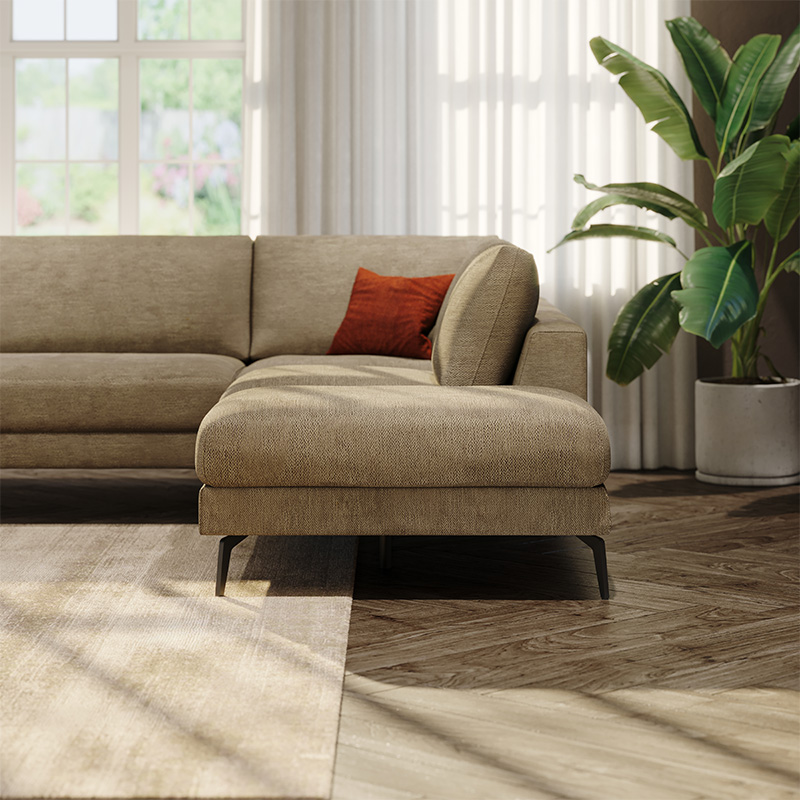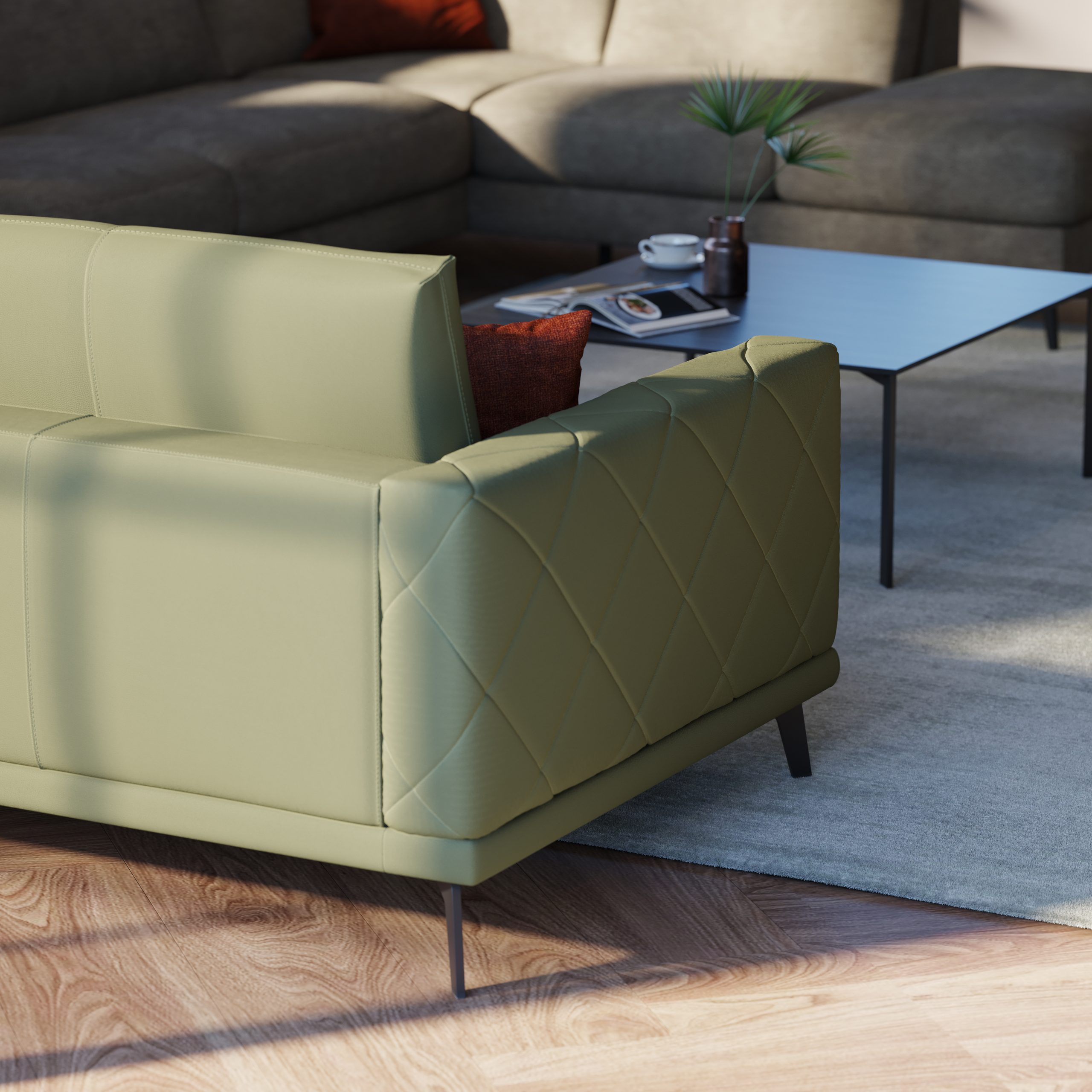 Njeno minimalistično vzdušje še dodatno izstopa v detajlu naslonjala za roke z linearnim prešitjem diamantnega vzorca. Z njim poudari obrtniško naravo sedežne garniture. Prešitje diamantnega vzorca izberete, če želite dodati garnituri poseben detajl ali se odločite za gladko izvedbo stranic.