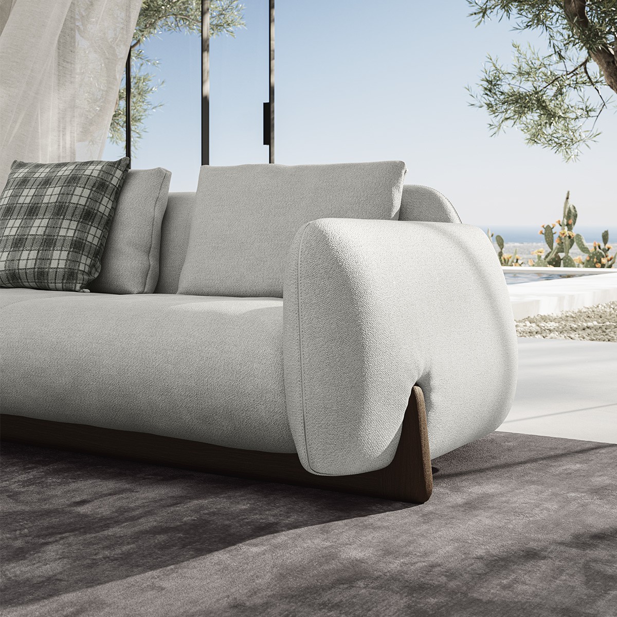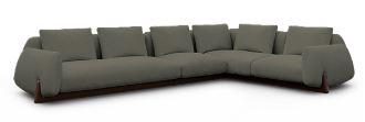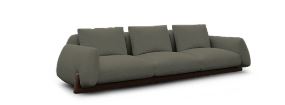 V tej prefinjeni sedežni garnituri, posamezne elemente drži skupaj lesena konstrukcija, ki podpira lahke, mehke volumne.‎ Trije temeljni elementi kavča – blazina, hrbtno naslonjalo in naslon za roke – se igrivo spreminjajo po višini, kar povečuje vizualno udobje.‎ Z domiselno optično iluzijo se zdi, da se gradu podobne linije kavča razhajajo, preden se združijo s ponavljajočimi se elementi in ustvarijo domiselno, gibljivo teksturo.