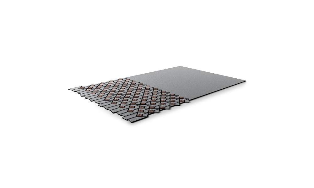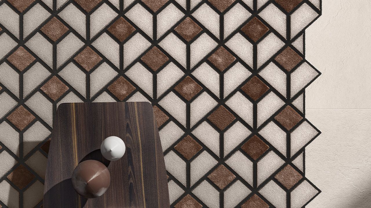 Preproga New Deco z retro dizajnom in geometrijskimi vzorci v terakotni barvi.