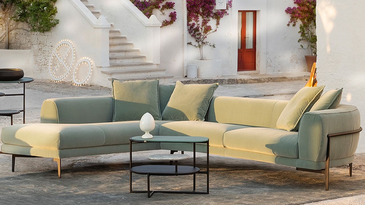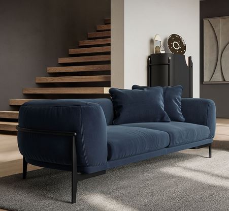 Sedežna garnitura Oblo vam nudi topel in velikodušni objem. Je kot varno okno, iz katerega opazujete kaj je onkraj stekla. Kovinska konstrukcija objema celotno oblazinjeno površino sedežne garniture in poudarja elegantno silhueto, kot pas okoli gibajočega se telesa.