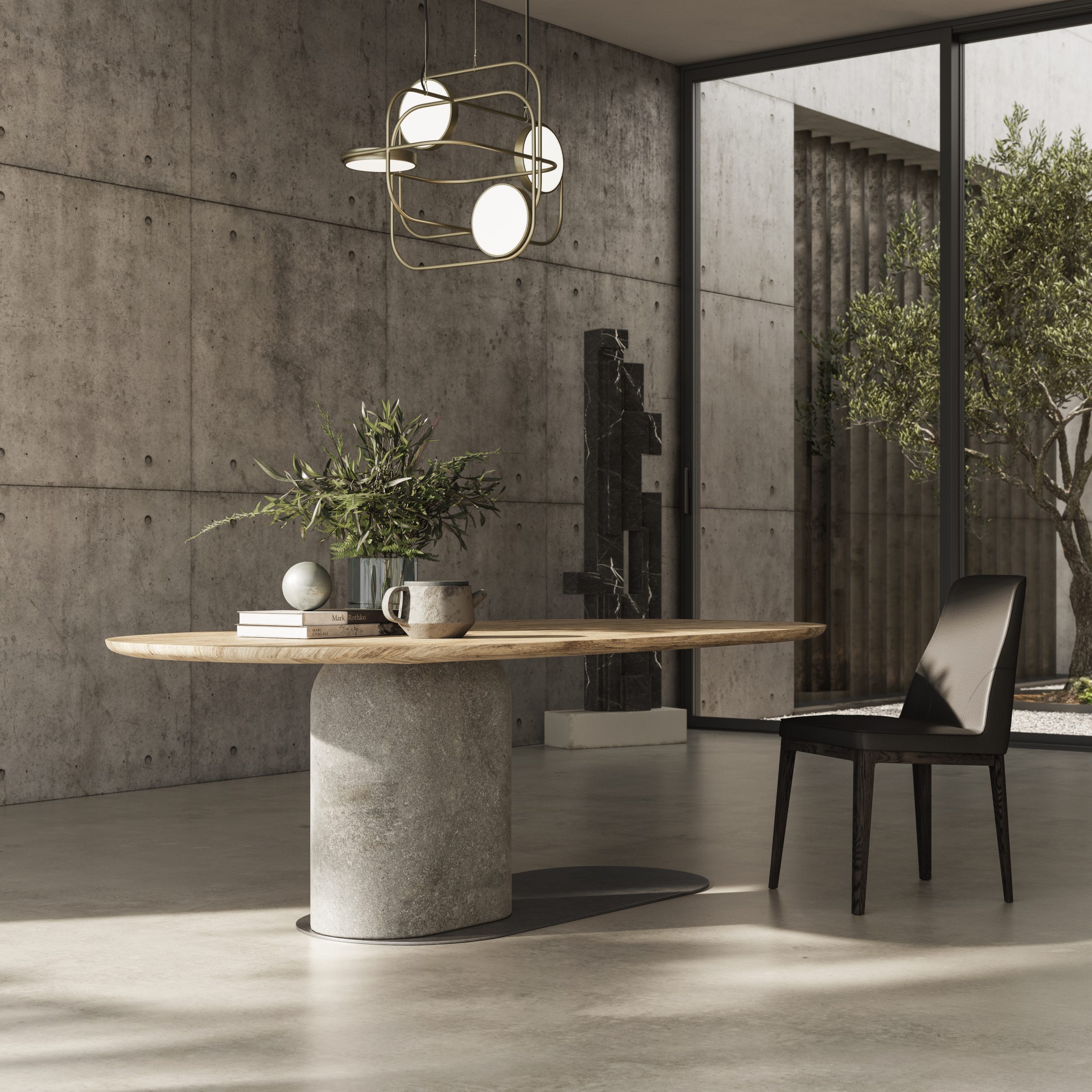 Z nosilno asimetrično nogo iz inovativne bio-malte z betonskim učinkom, zgornjim delom z lesenim zaključkom in sijočim kovinskim podnožjem Ombra govori o svoji odlični izdelavi. Bio-Malta ima mat, biokompatibilno in okoljsko trajnostno površino, ki jo je enostavno vzdrževati. Bio-Malta je mešanica posameznih komponent na vodni osnovi z mešanico naravnih materialov in debelino približno 2 mm.