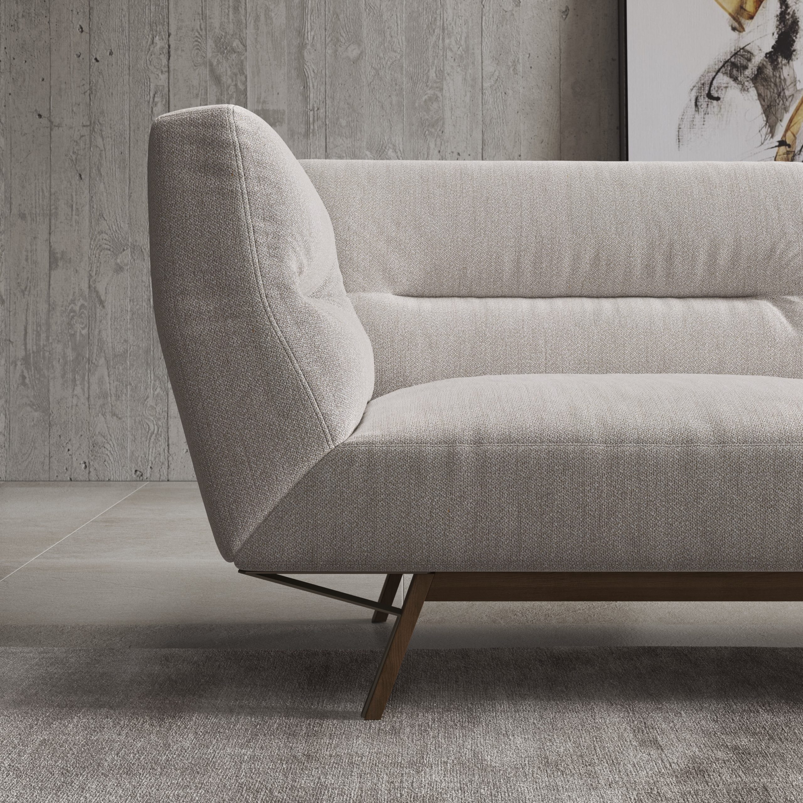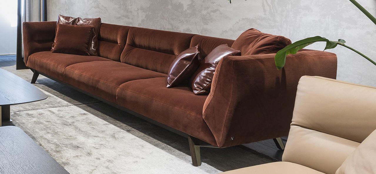 Dizajn je interpretiran v krepkih linijah in popolnem udobju razkošne sedežne garniture Positano, s poudarkom na osupljivi natančnosti posameznih detajlov in na prefinjenem oblazinjenju. Dekorativni šivi v obliki detajlnih črt krasijo naslon za hrbet in rokonaslone. Podnožje je iz masivnega dimljenega hrastovega lesa, v kombinaciji z zapeljivimi detajli iz brušene medenine.