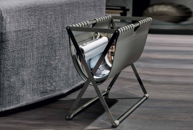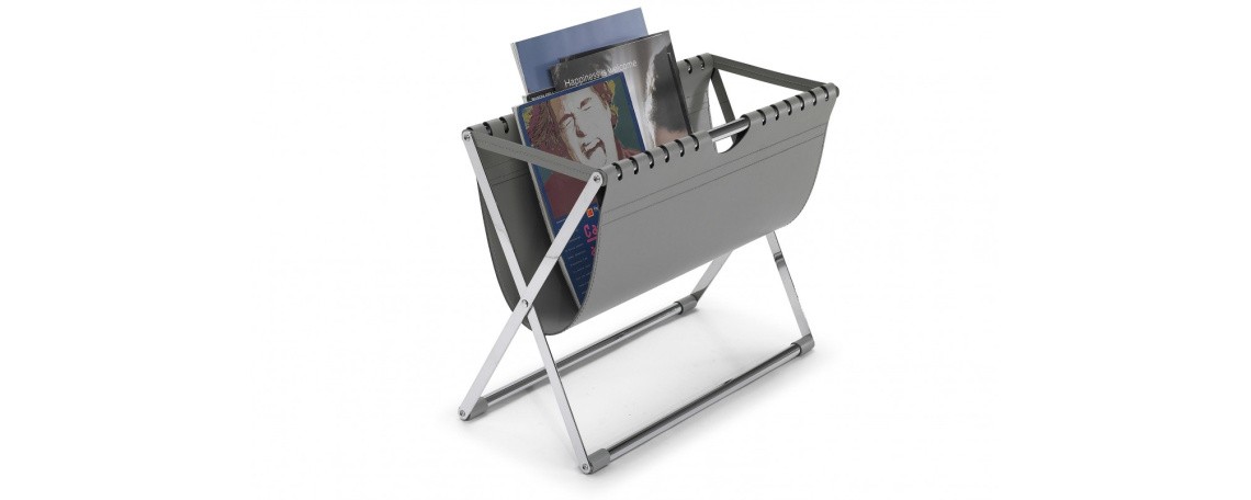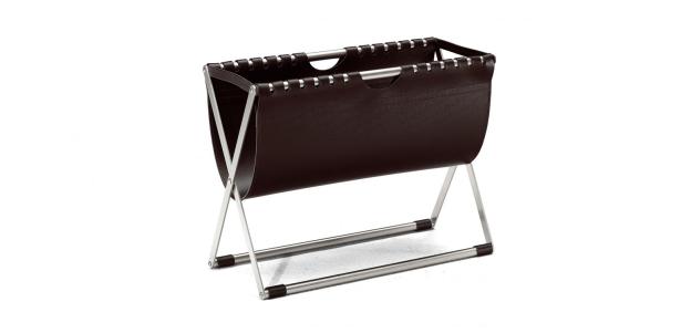 Temno rjav ali siv nosilec za revije iz regeneriranih usnjenih vlaken. Lakirana kovinska konstrukcija, nikljev zaključek. Okrogle noge iz regeneriranih usnjenih vlaken.