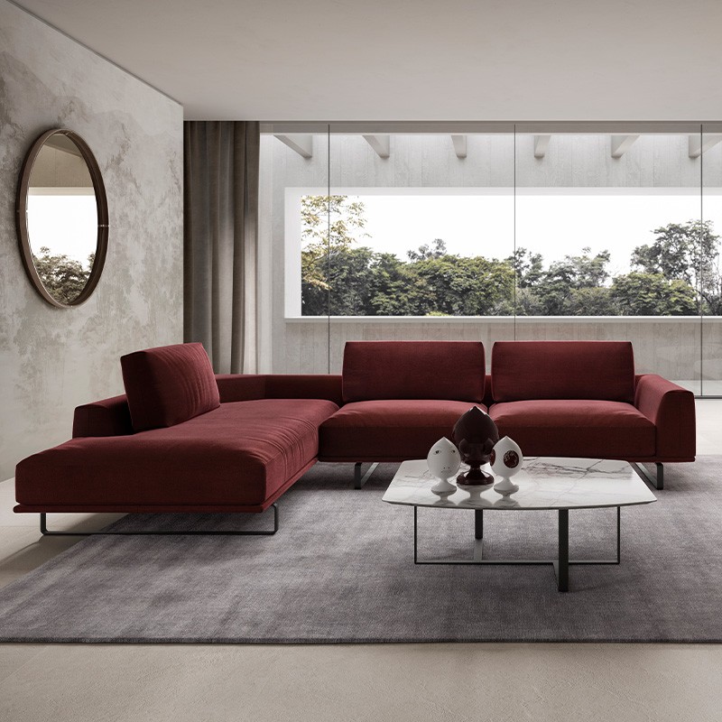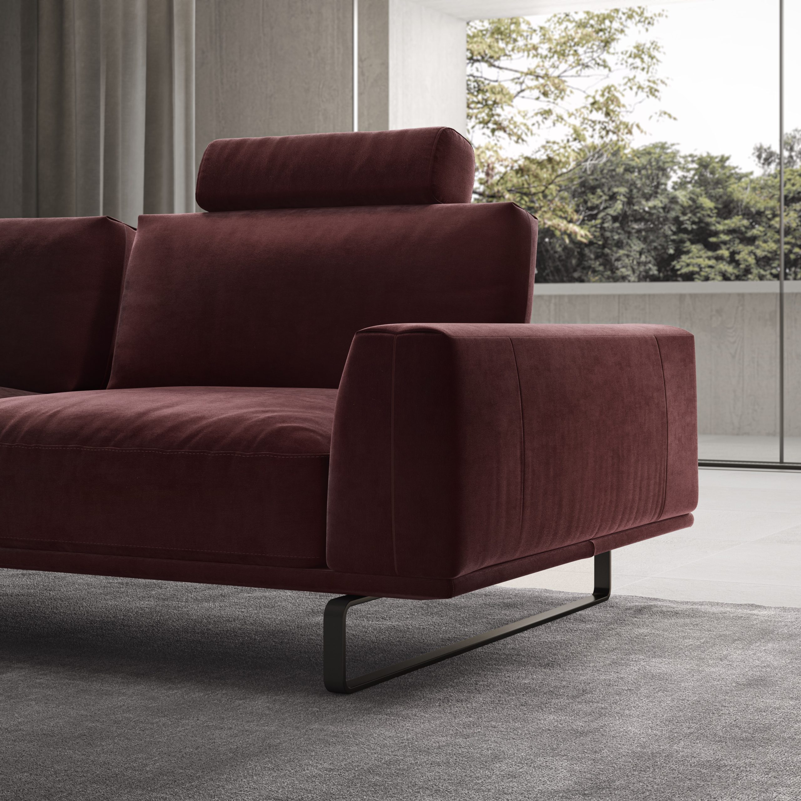 Široki nasloni za roke kljub dimenzijam delujejo minimalistično a hkrati dajejo prepoznaven in močan značaj. Elegantno podnožje ima posebno temno sivo kovinsko prevleko, katera daje sedežni garnituri edinstven izgled.