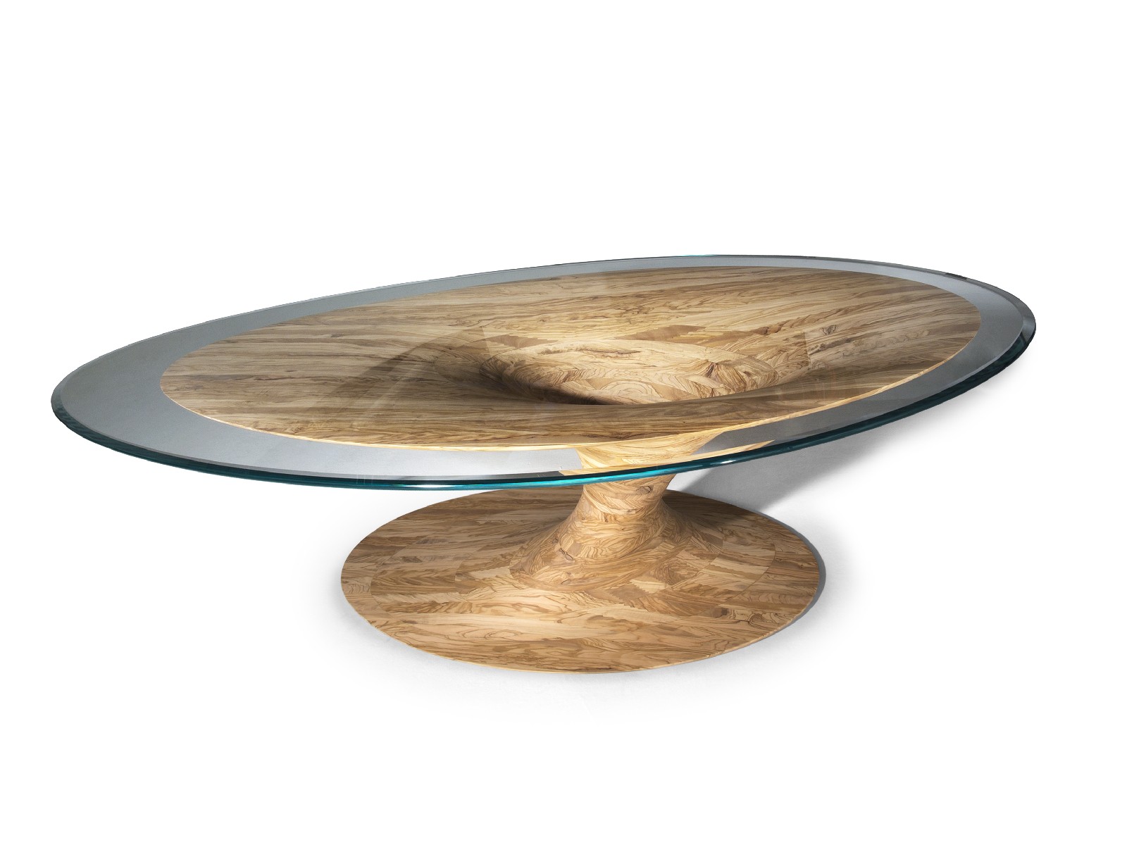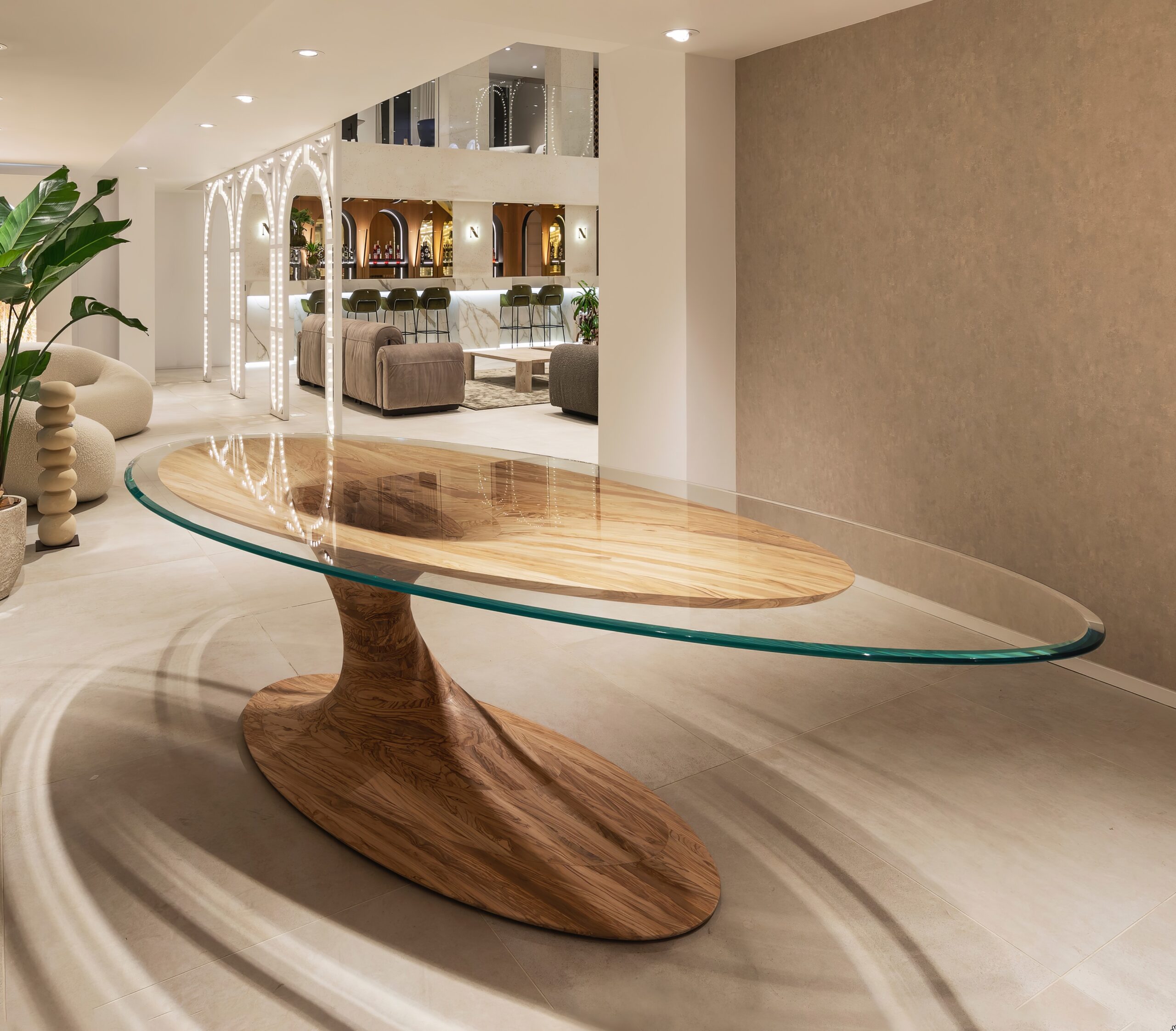 Uragano je jedilna miza, ki se poklanja lepoti in naravnemu bogastvu apulijskega ozemlja. Veliko ovalno stekleno površino podpira veličastno podnožje iz oljčnega lesa, ki se zdi, kot da se razprostira v prostoru kot deblo stoletne oljke, ki se začne pri tleh in njenih močnih koreninah ter raste navzgor, da izkoristi sonce in vetrič, ki dajeta barvo Apuliji. Uragano se zdi, kot da se ovija okoli svoje opore in ustvarja asimetričen učinek, ki jedilno mizo spremeni v gibljivo skulpturo.