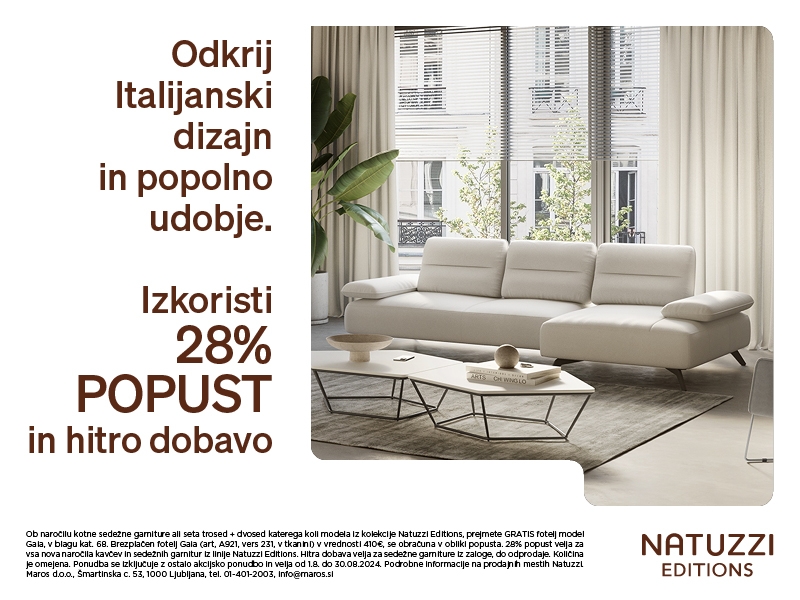 Hitra dobava in 28% popust velja na sestave sedežnih garnitur, ki so na zalogi in sicer od 1.10. do 30.10.2025 oz. do odprodaje. Količina je omejena. Podrobne informacije na prodajnih mestih Maros in Natuzzi v Celju in Ljubljani, na info@maros.si in tel. 01-401-2030.