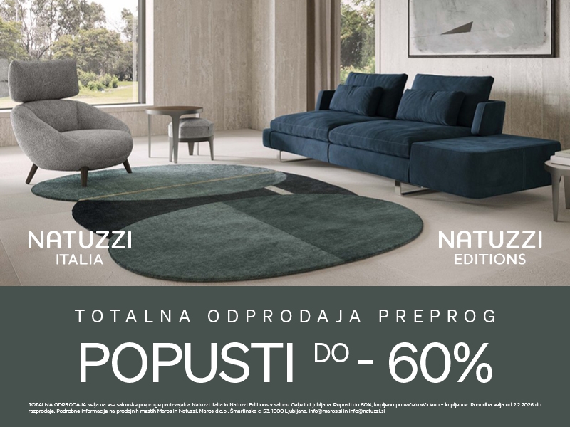 TOTALNA ODPRODAJA velja na vse salonske preproge proizvajalca Natuzzi Italia in Natuzzi Editions v salonu Celje in Ljubljana. Popusti do 60%, kupljeno po načelu »Videno – kupljeno«. Ponudba velja od 2.2.2026 do razprodaje. Podrobne informacije na prodajnih mestih Maros in Natuzzi. Maros d.o.o., Šmartinska c. 53, 1000 Ljubljana, info@maros.si in info@natuzzi.si