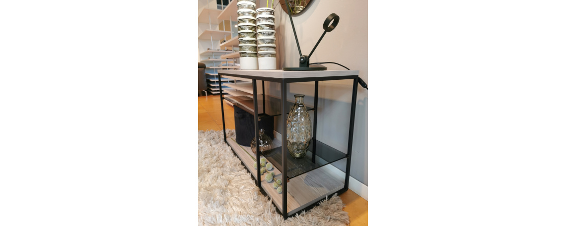Konzola ravnih, geometrijskih linij v kombinaciji antracid kovine, dimljenega stekla in furnirja olmo barve.