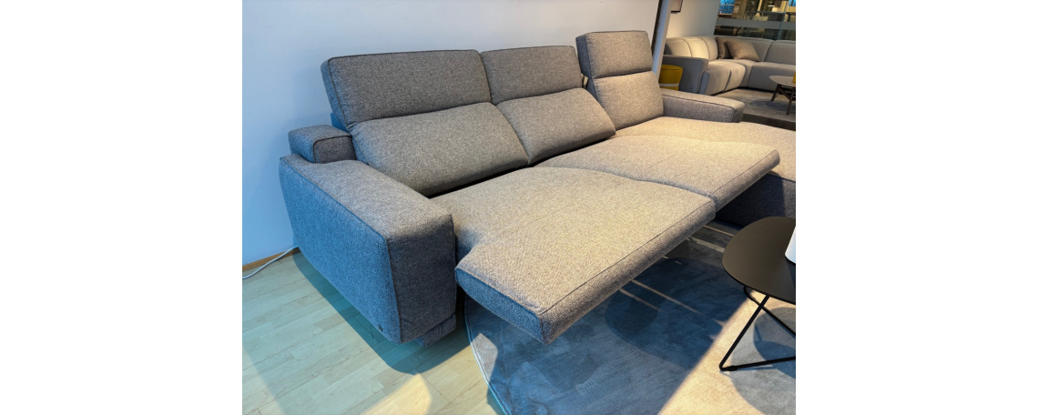 ODPRODAJA SE: kotna sedežna garnitura Iago z dvema Relax električnima počivalnikoma. Vsi nasloni za glavo so nastavljivi po višini. Sedežna garnitura je oblazinjena v sivo tkanino.