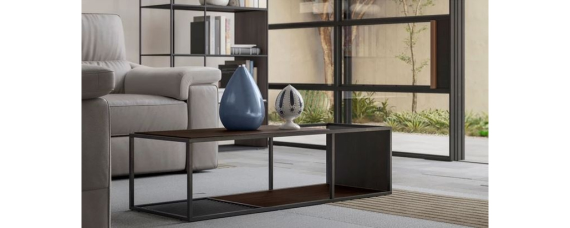 Površine, police in stranski paneli centralne mizice so iz furnirja v hrastu v kombinaciji z površino iz glajenega, brušenega marmorja Volakas. Stranska mizica na voljo v marmorju ali furnirju