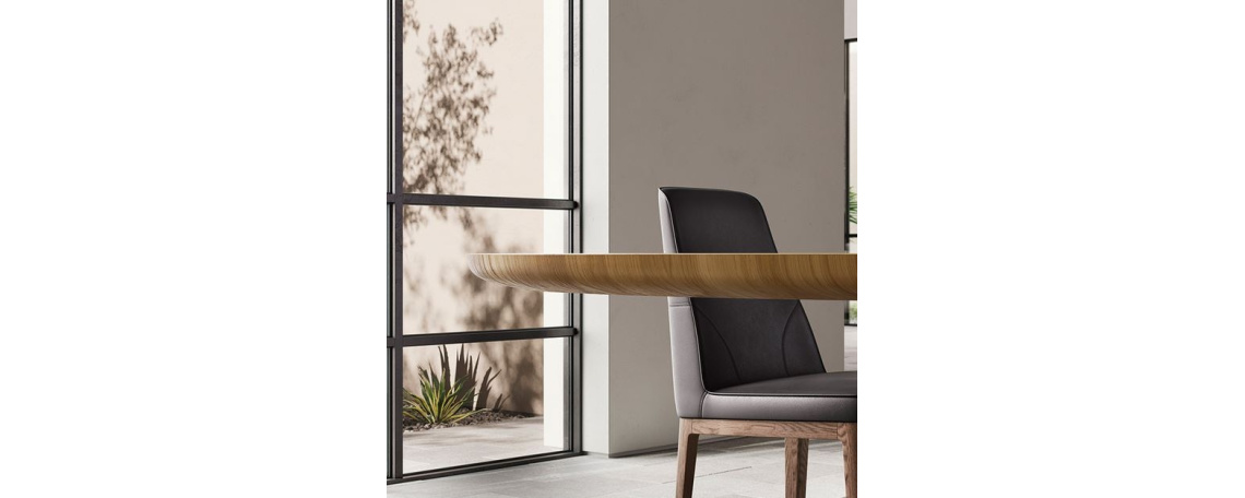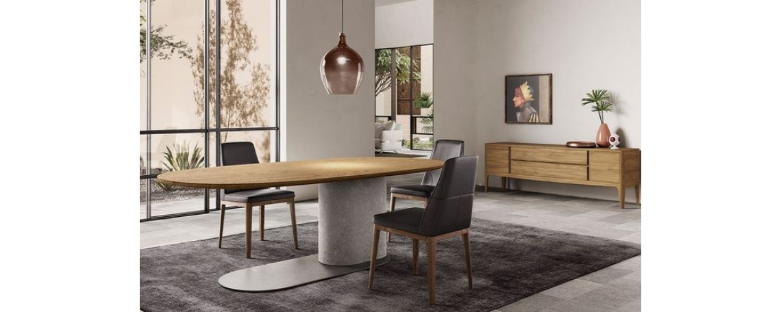 Jedilna miza je tekoča in elegantna skulptura z prefinjenim dizajnom. Ima asimetrično oporno nogo z kovinsko osnovo, ki simulira odsev njegove zgornje sence. To popolnoma odkriva naravo tega, kar predstavlja: »gostoljubna sprejemna miza, ki očitno lebdi nad trdno anorgansko osnovo«.