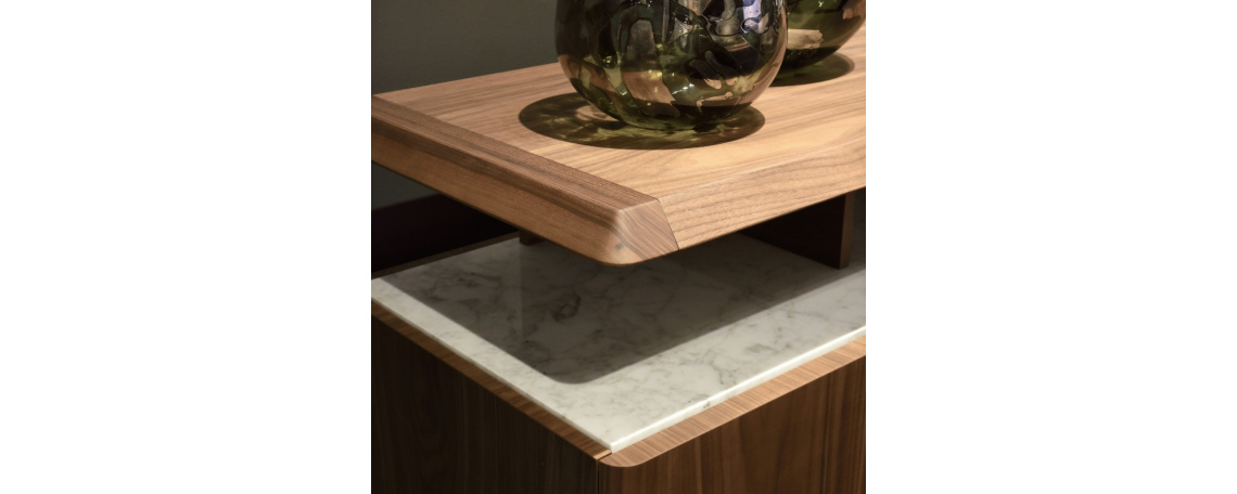 Visoka kredenca je dopolnjena z marmorno ploščo Volaks, ki je polirana, brušena in v notranjosti v celoti iz lesa. Dodatni notranji predali z odpiranjem Blum motion mehanizmom.
