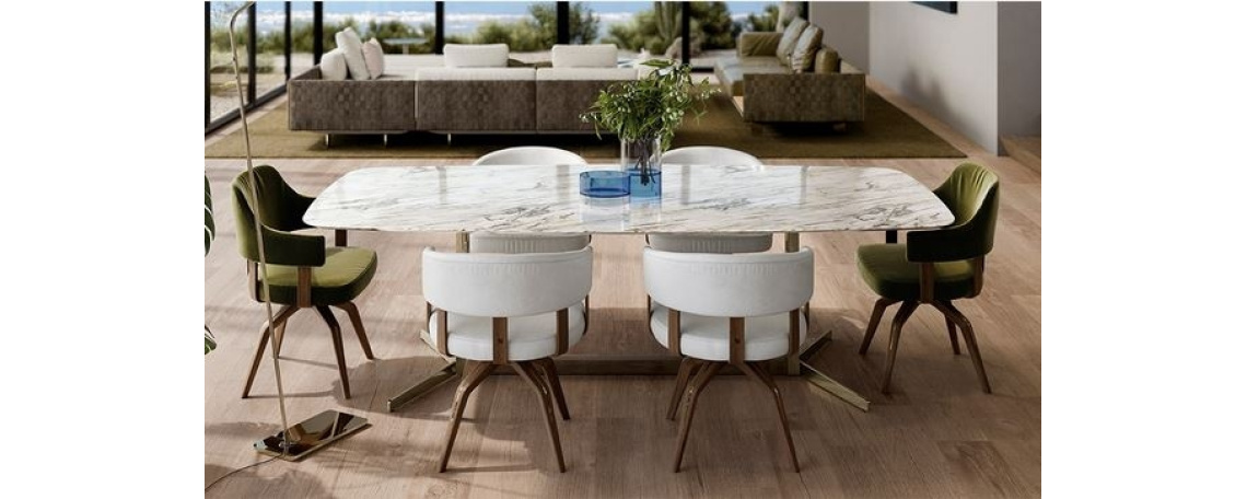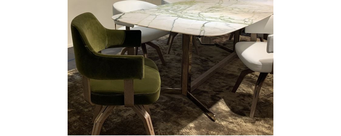 Stol VALLE spominja na » cockpit ». Osrednja noga iz masivnega jesenovega lesa, krtačenega in barvanega v tobaku, ima funkcijo prostega vrtenja. Naslonjalo povezano z sedalnim delom z večplastnimi lesenimi oporami, kar dodatno poudari formalno – brezčasni vidik stola. Okrasni vstavki na podnožju iz nerjavečega jekla v barvi šampanjca.